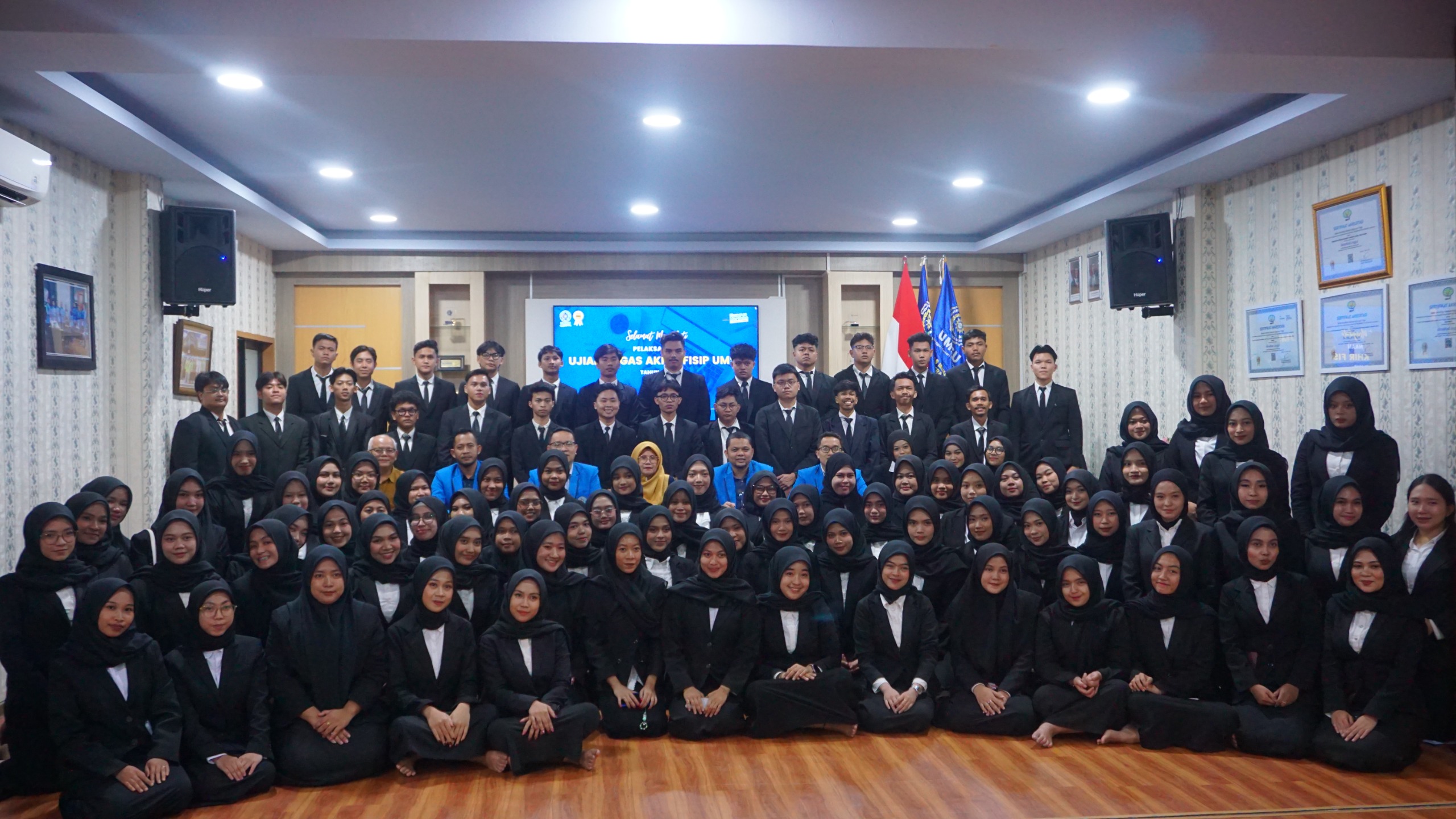 Dari total peserta, 65 mahasiswa berasal dari Ilmu Komunikasi, 32 dari Ilmu Administrasi Publik, dan satu dari Kesejahteraan Sosial. Pelaksanaan sidang berlangsung sejak pagi hingga selesai, dengan suasana tertib dan penuh kekhidmatan.